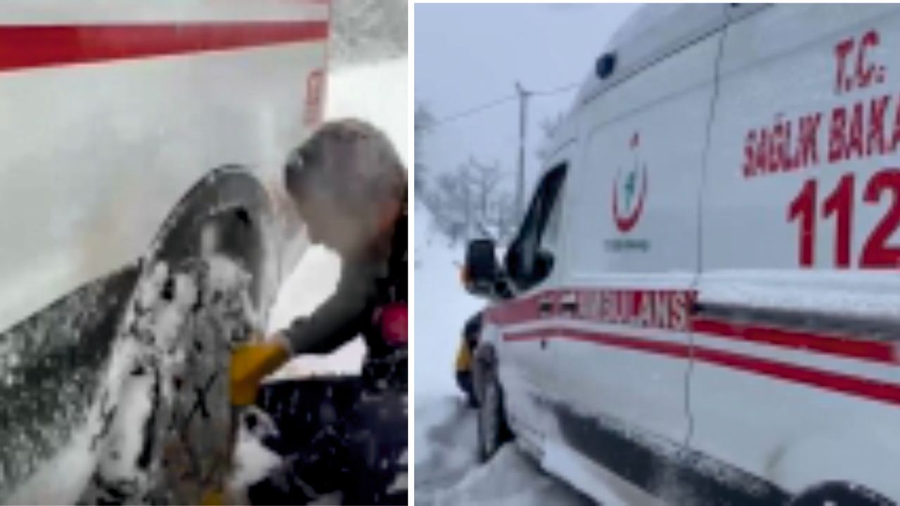 Bir süre sonra kara saplanarak yolda kalan ambulanstaki sağlık personeli, dondurucu soğuğa ve yoğun yağışa rağmen araçtan inerek çalışma başlattı. Lastiklere zincir takarak aracı saplandığı yerden kurtaran ekipler, zorlu mücadelenin ardından yola devam ederek hastaya ulaştı.